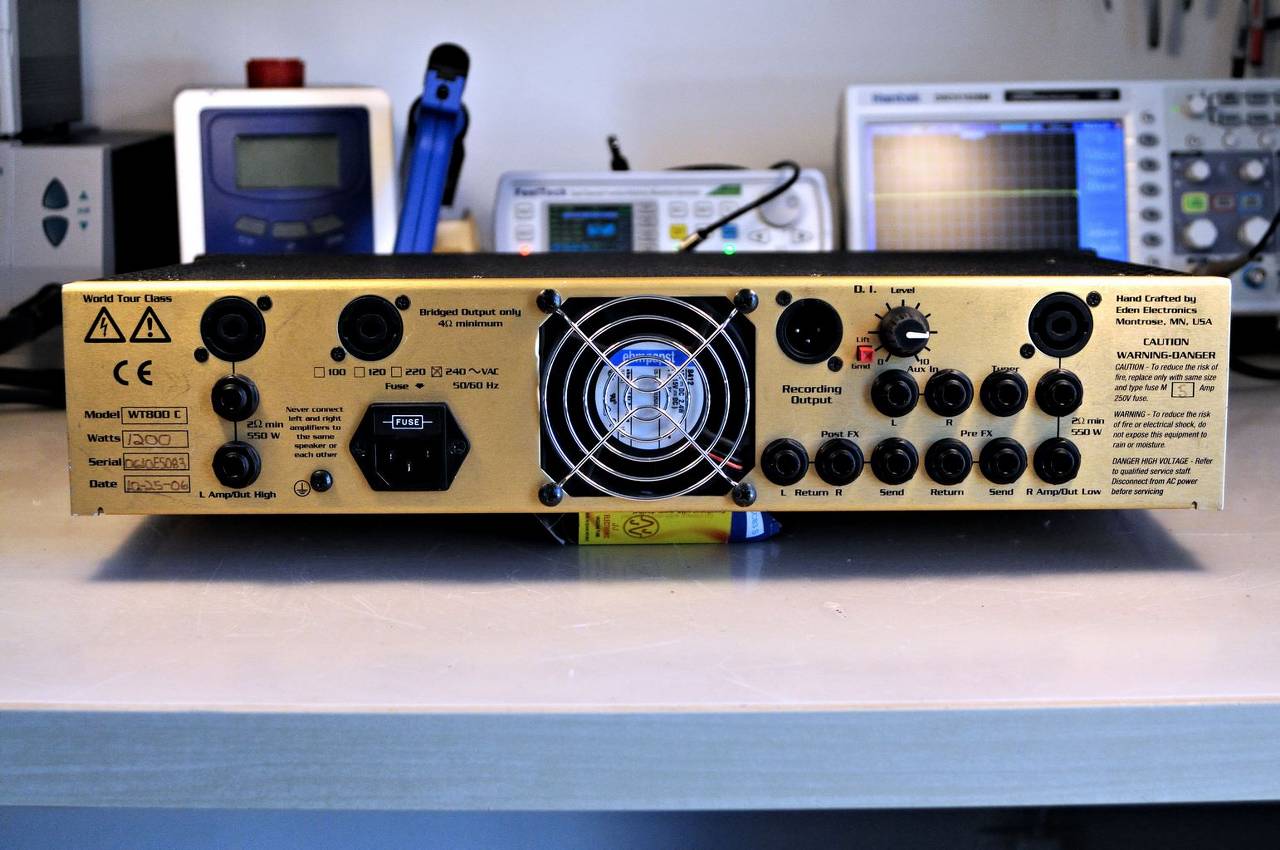 EDEN WT800 to jednokanałowy, hybrydowy, stereofoniczny wzmacniacz osiągający w/g katalogu moc 2x 440W na 4Ohm lub 1 x 880W na 8ohm. Jak to zwykle bywa, katalogom nie ma co za bardzo wierzyć, więc i w tym przypadku producent nas "ściemnia" , czyli perfidnie "kłamie w żywe oczy".. Ten wzmacniacz nie ma żadnych 880W, tylko spokojnie, bez większego wysiłku "wykręca" się na prawie 1200W na 8Ohm. Takie "kłamstewka" to ja rozumiem :)